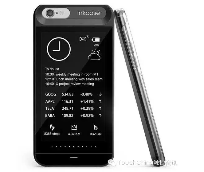 雖然是智能手機(jī)的第二屏,InkCase其實更像是一個通過藍(lán)牙和手機(jī)連接的智能硬件,跟智能手表Pebble類似,只是位置變了。所以它不能(或者說不想)實現(xiàn)雙屏同步。InkCase內(nèi)置有存儲器和解碼芯片,app上想要顯示到第二屏的信息,通過藍(lán)牙發(fā)送到InkCase轉(zhuǎn)換解碼并通過電子墨水顯示出來。