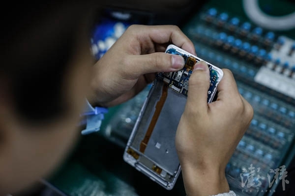 工作人員正在對主板進(jìn)行標(biāo)記。主板生產(chǎn)是除物料采購?fù)?,生產(chǎn)手機(jī)環(huán)節(jié)的第一個(gè)步驟。