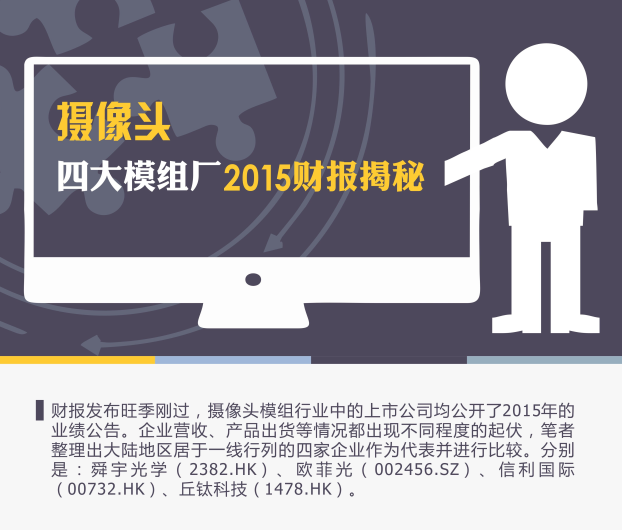 攝像頭四大模組廠2015年周報揭秘,由于年報集合了企業(yè)全年各項信息,過于冗長,筆者今次將其中幾個關(guān)注點進(jìn)行整理,借一張圖讓大家輕松讀取財報信息。