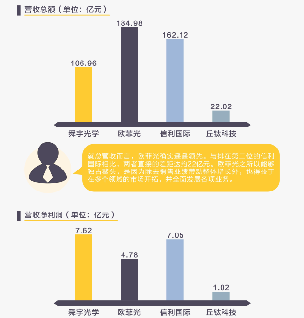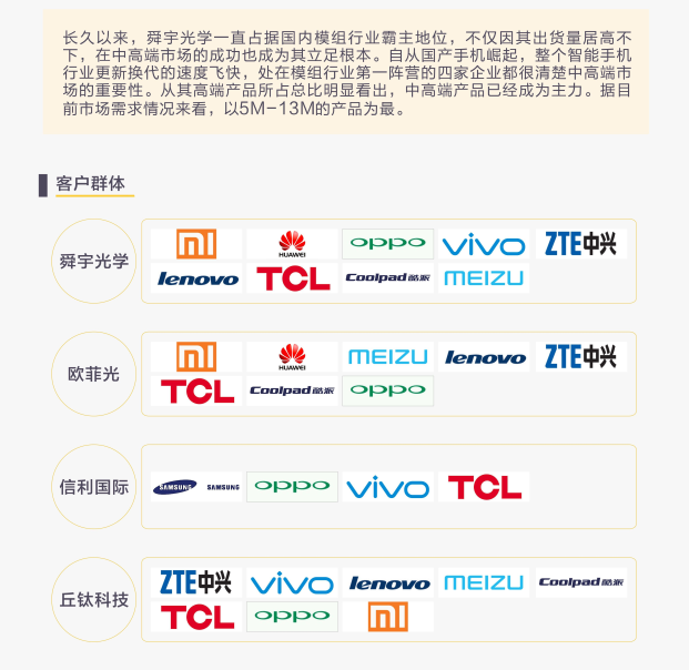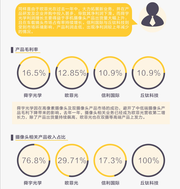 圖中從營收、凈利潤、產(chǎn)品毛利率、攝像頭相關(guān)產(chǎn)品收入占比、研發(fā)投入、攝像頭模組出貨總量、5M以上攝像頭模組產(chǎn)品占比、以及客戶群體,八個方面進(jìn)行比較。