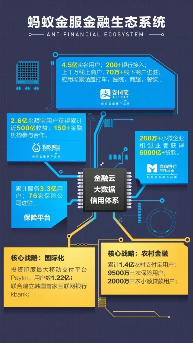 目前,螞蟻金服擁有全球最大的支付平臺(tái)支付寶,實(shí)名用戶已超4億,同時(shí)擁有中國(guó)最大的貨幣基金余額寶,已為用戶盈利超過(guò)400億。
