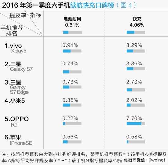 最先打出“充電五分鐘,通話兩小時”口號的OPPO手機(jī),在一季度手機(jī)的縱向比較中,快充功能的確得到最多消費(fèi)者的好評,但電池耐用程度卻倍受消費(fèi)者質(zhì)疑。3600mAh電池,采用雙引擎閃充的vivoXplay5綜合推薦系數(shù)更高。沒有采用快充技術(shù)的iPhoneSE在快充排名上依然墊底。(如圖4)
