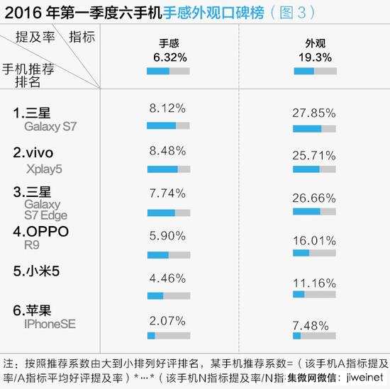 在手感和外觀評價上,iPhoneSE采取了和iPhone5S近乎相同的配置,沒有給消費(fèi)者耳目一新的感受,手感外觀推薦系數(shù)也在一季度手機(jī)里墊底。三星S7系列以及首次曲屏嘗試的vivoXplay5,在外觀和手感都受到消費(fèi)者認(rèn)可。(如圖3)