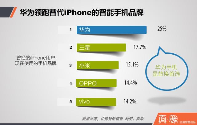 排名第一的是華為手機。在調(diào)查的數(shù)千名iPhone“離開者”中,25%的用戶目前在使用華為手機。