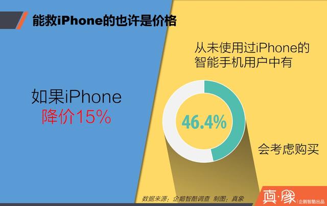 數(shù)據(jù)和結(jié)論會讓庫克感到開心么?46.4%的“從未買過iPhone”的用戶,在降價15%后,會考慮購買——在前面的調(diào)查中我們已經(jīng)提到,非iPhone用戶對價格更為敏感。