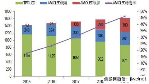 2015-2019手機(jī)用AMOLED快速滲透(百萬片)