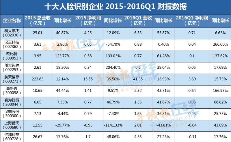 2015年以來,已有騰訊、阿里、民生銀行等多個(gè)行業(yè)巨頭紛紛加碼人臉識(shí)別產(chǎn)業(yè)。國內(nèi)外巨頭紛紛加碼人臉識(shí)別技術(shù),將直接助推產(chǎn)業(yè)的爆發(fā)性增長。這里將科大訊飛(002030)、漢王科技(002362)、歐比特(300053)、川大智勝(002253)、航天信息(600271)、航天信息(600271)、高新興(300098)、賽為智能(300044)、漢鼎股份(300300)、上海普天(600680)和佳都科技(600728)的發(fā)展現(xiàn)狀及財(cái)報(bào)信息做一個(gè)梳理,以便于更直觀的了解。