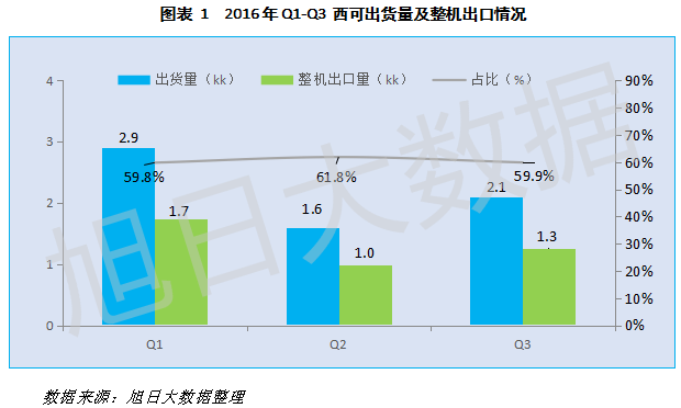 2016年前三季度,西可出貨量達(dá)到6.6kk,由于西可客戶均為海外品牌商,導(dǎo)致西可絕大部分出貨都通過SKD或者整機(jī)的形式流向海外市場。海關(guān)數(shù)據(jù)顯示,西可前三季度整機(jī)出口量達(dá)到4kk,占西可整體出貨量的60.3%。注意本文數(shù)據(jù)依據(jù)為西可整機(jī)出口數(shù)據(jù)。