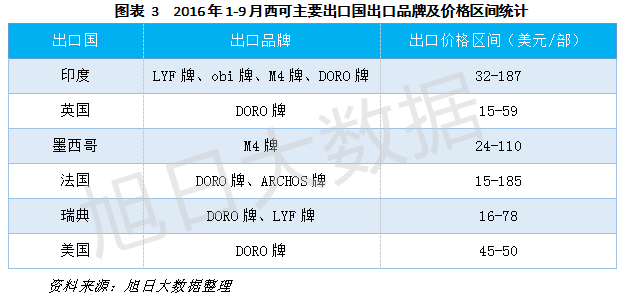 從出口單價(jià)價(jià)格區(qū)間來看,西可產(chǎn)品價(jià)格覆蓋范圍比較廣,在15——190美元/部之間,其中以50-100美元/部的競爭力較強(qiáng),而超過100美元的產(chǎn)品出口至印度、墨西哥、法國,主要品牌是LYF、M4、ARCHOS,在英國、美國均只出口DORO牌手機(jī),由于DORO為瑞典的老人機(jī)品牌,故出口價(jià)格區(qū)間偏低,在15-59美元之間。
