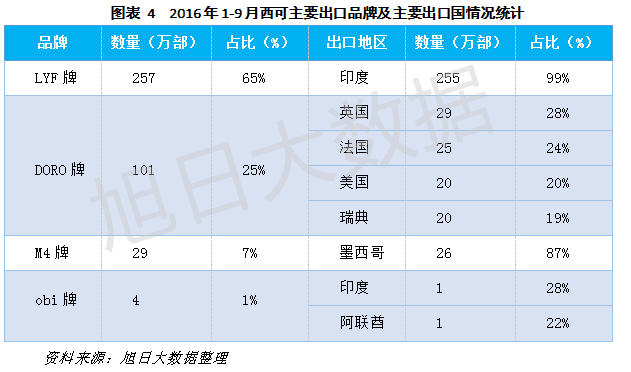 從出口國來看,西可在全球覆蓋范圍雖然廣,已覆蓋六大洲,但是涉及國家及地區(qū)卻并不多,出口國及地區(qū)僅有26個(gè)。2016年前三季度,西可整機(jī)主要出口至印度、英國、墨西哥、法國、瑞典、英國,出口量近400萬部,占比達(dá)95%。最大出口國為印度,出口量達(dá)257萬部,占比高達(dá)64%。