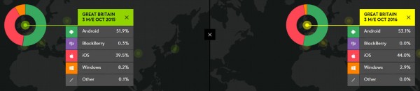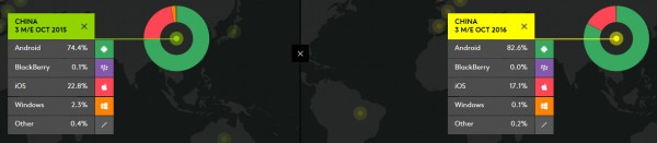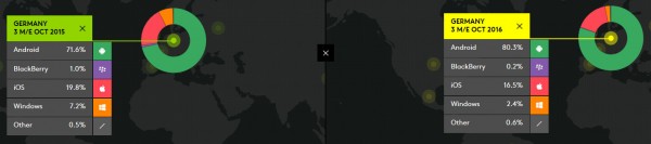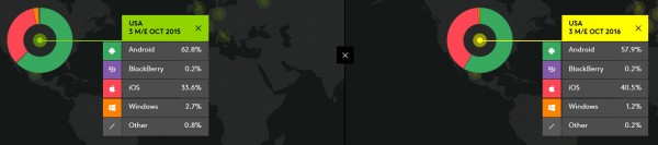 來自Kantar Worldpanel的最新季度數(shù)據(jù)顯示,在美國智能手機(jī)市場,蘋果iOS設(shè)備在第三季度市場銷售總份額當(dāng)中占比達(dá)到40.5%,和去年同期相比,份額上升7%,這在很大程度上受益于三星Galaxy Note 7召回事件。但是在中國智能手機(jī)市場,iPhone面臨本地Android競爭對手更激烈的競爭,如市場份額極速上升的OPPO等等,蘋果在第三季度中國智能手機(jī)銷售額中占比17.1%,低于前一年的22.5%。而在歐洲德國市場,iPhone第三季度市場份額下降2.7個百分點(diǎn)至16.5%。