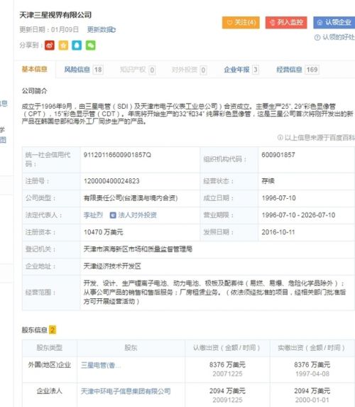 此外,天津經(jīng)濟(jì)技術(shù)開發(fā)區(qū)國際商會官網(wǎng)介紹顯示,三星視界是由韓國三星SDI株式會社與天津市中環(huán)電子信息集團(tuán)1996年共同投資組建的大型合資企業(yè),總投資額1.05億美元,占地面積近36萬平方米,現(xiàn)有員工三千余人。