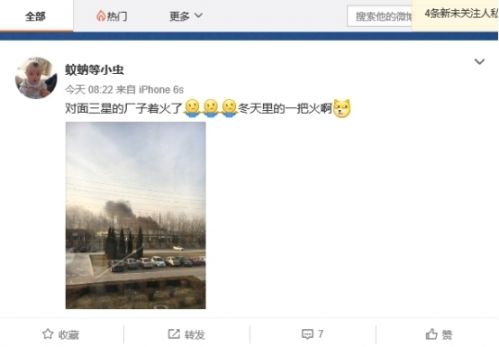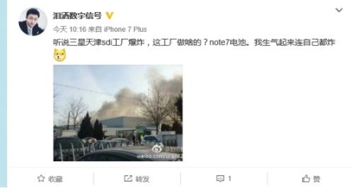 在三星Note7爆炸風(fēng)波之后,三星手機(jī)電池供應(yīng)商三星SDI再次引發(fā)輿論關(guān)注。2月8日上午,有微博用戶曝料稱“聽說三星天津武清區(qū)工廠爆炸,這工廠做啥的?Note7電池。”,同時還上傳了多張疑似火災(zāi)照片。