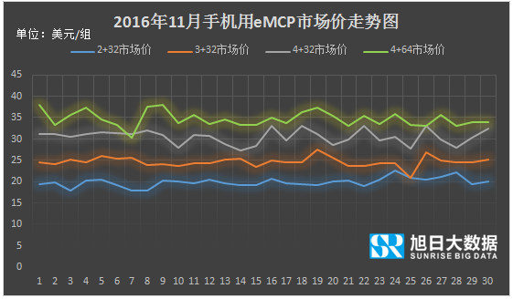 而2GB+32GB、3GB+32GB及以上容量的eMCP由三星、海力士、鎂光、東芝壟斷,價格方面全憑廠商議價能力,價格波動幅度也較大。旭日大數(shù)據(jù)價格跟蹤顯示,各容量eMCP價格在11月內(nèi)仍處于上漲趨勢,漲勢不明顯。