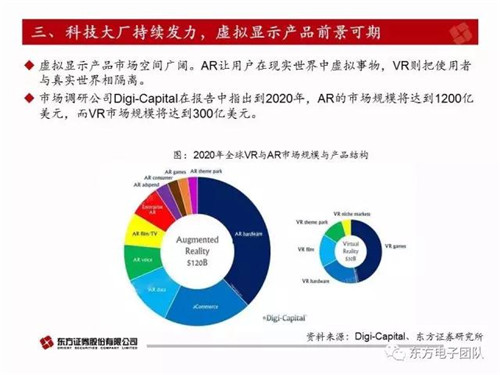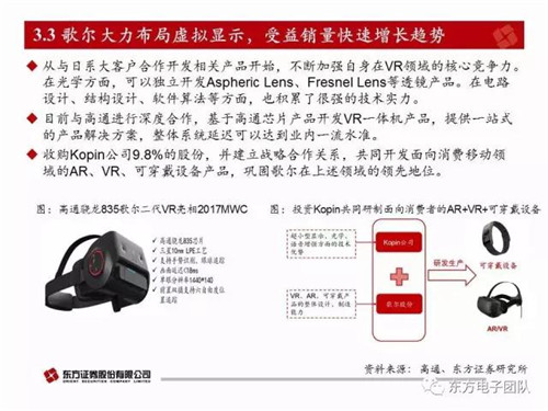 科技大廠持續(xù)發(fā)力,虛擬顯示產(chǎn)品前景可期:目前,AR/VR硬件還處于發(fā)展階段,而大陸電子廠商已越來越多地參與到AR/VR產(chǎn)業(yè)的研發(fā)制造中,未來隨著硬件布局完善、產(chǎn)能逐步釋放、相關技術成熟、應用內容豐富,AR/VR將成為ICT市場上少見的高增長產(chǎn)品。歌爾不斷加強自身在虛擬顯示領域的核心競爭力,17年有望借助日系大客戶銷量成倍級的增長,從而帶動公司虛擬顯示產(chǎn)品的收入快速增長。