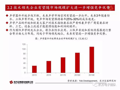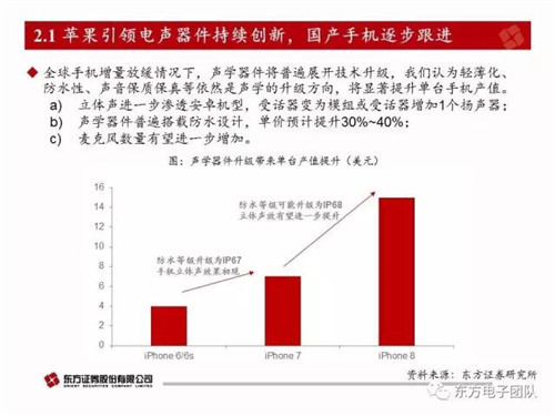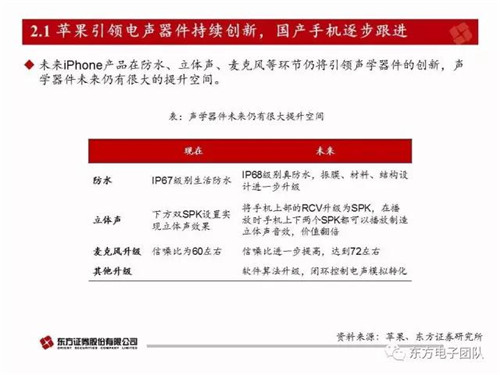 聲學器件迎來新一輪升級:預計未來的iPhone產(chǎn)品在防水、立體聲、麥克風等環(huán)節(jié)將繼續(xù)引領聲學器件的創(chuàng)新,聲學器件未來仍有很大的提升空間,而國產(chǎn)手機的逐步跟進也將推動聲學器件升級的普及,電聲市場有望保持每年25-30%的成長速度,將超過100億美元。公司具備先進聲學器件設計與生產(chǎn)能力,將進一步鞏固全球電聲行業(yè)領先地位。