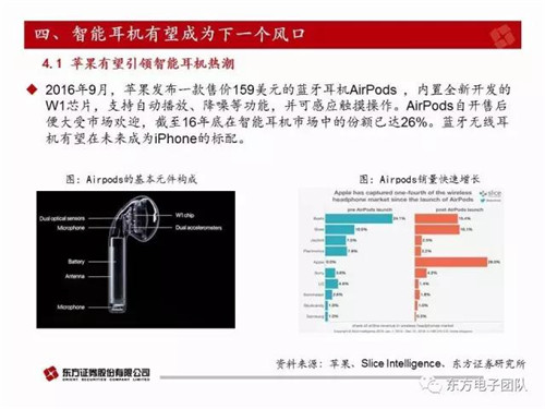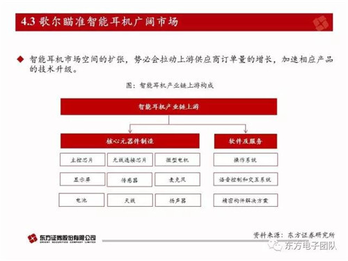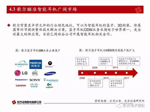 智能耳機有望成為下一個風口:蘋果去年發(fā)布AirPods,有望引領智能耳機熱潮,推動全球耳機智能化進程,在此趨勢下耳機傳輸技術與核心元件將迎來升級需求,歌爾可以為智能耳機的藍牙、3D封裝、傳感器等環(huán)節(jié)提供整體技術解決方案,在市場占有絕對領先地位,目前公司已瞄準智能耳機的廣闊市場,并同硅谷公司展開關于智能耳機相關合作,未來有望實現(xiàn)新的業(yè)績增長。