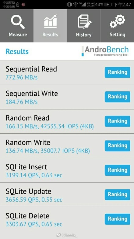 百度貼吧曝光的華為P10用戶對(duì)閃存讀寫(xiě)速度的測(cè)試,出現(xiàn)巨大差異,讀寫(xiě)速率在200-800MB/s之間不等