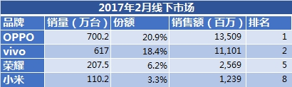賽諾數(shù)據(jù)顯示,2017年3月國(guó)內(nèi)手機(jī)市場(chǎng)出貨量4187.1萬(wàn)部,同比下降6.3%,延續(xù)了往年3月銷售淡季的慣例。OPPO、vivo、華為依然穩(wěn)居國(guó)內(nèi)前三。