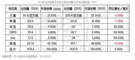 在2016全球手機(jī)市場占有率及總銷量排名中,國產(chǎn)手機(jī)中有三個(gè)品牌擠進(jìn)了前五。華為、OPPO、Vivo在國內(nèi)亦是三足鼎立,搶走了三星和蘋果的市場份額。