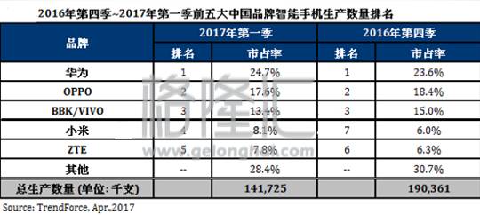 2016年第四季——2017年第一季全球前六大智能手機(jī)品牌生產(chǎn)數(shù)量排名
