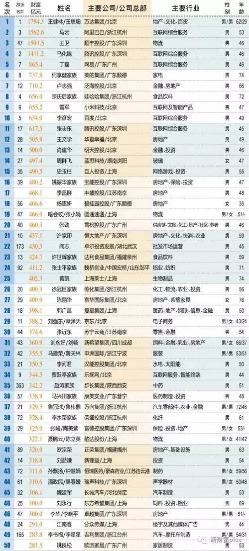 從整體排行榜來看,王健林、王思聰父子以1794.3億元的財富仍然穩(wěn)坐首富寶座。馬云位居其后,財富達到1562.6億元。深圳巨富、順豐創(chuàng)辦人王衛(wèi)憑借1504.5億元的身價取代馬化騰,躋身富人榜的前三位。雖然看起來,王健林、王思聰、馬云、馬化騰等頂級富人仍占據(jù)榜單的重要位置,但其實這支榜單一直在悄無聲息地發(fā)生著一些改變變。