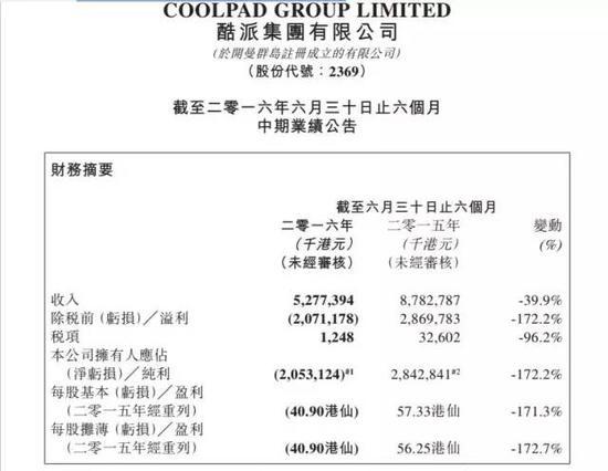 酷派集團(tuán)之前業(yè)績(jī)公告顯示,2016年上半年?duì)I業(yè)收入為52.77億港元,與2015年同期營(yíng)收的87.83億港元相比,降低了39.9%。