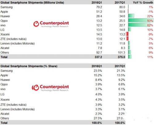 (圖片:全球智能手機(jī)出貨量2017年Q 1對比2016年Q1)
