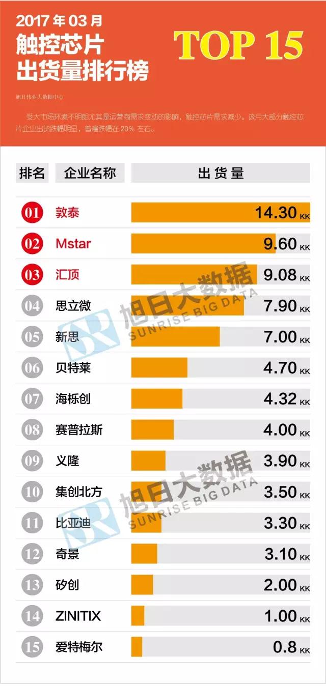 受大市場環(huán)境不明朗尤其是運營商需求變動的影響,觸控芯片需求減少。該月大部分觸控芯片企業(yè)出貨跌幅明顯,普遍跌幅在20%左右。