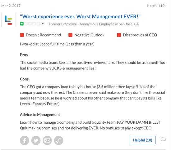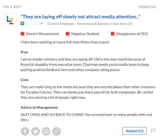 在一封名為《 賈躍亭在北美全線潰敗后,懦弱地回到北京躲在龜殼里》的評價里,一位員工在5月16日指出了公司在“不誠實”地裁退員工——不僅不能誠實公布公司當前的狀況,甚至繼續(xù)為員工畫大餅忽悠。