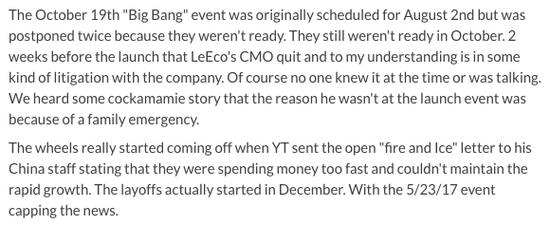 不過, Big Bang發(fā)布會背后還有更多的內幕。“這場預計安排在8月2日的活動被一拖再拖,至少拖延兩次才安排到10月進行的。實際上,樂視到10月也沒有完全準備好。在發(fā)布會前兩周樂視CMO因為和公司的訴訟突然從公司離職。當然,最終他沒有來到現場,更無法按照最初的安排演講。而對員工,公司只是表示這位高層家中有急事。”
