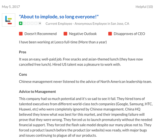 “看看這里所有的正面評價,樂視應該為此感到羞恥。”前員工這樣評論道。