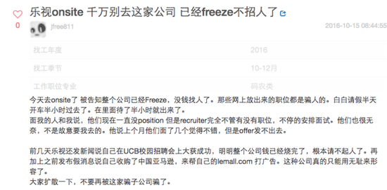 在美國華人工程師論壇“一畝三分地”中,一名網名為jfree811的網友在結束樂視的面試后寫下了“樂視onsite,千萬別去這家公司,已經freeze不招人了”的帖子。