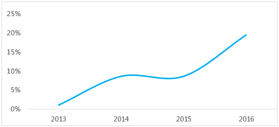圖表1 2013-2016年小米智能機出貨量海外市場占比