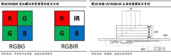 影響虹膜發(fā)展的原因之一是虹膜開孔多,增加虹膜識別會嚴(yán)重影響手機(jī)外觀。有機(jī)會解決此方法就是做成 RGBIR 攝像頭,即將其中一個 G 的光線采集變成 IR(紅外)的光線采集。這樣的好處是,做前攝像頭的時候,對 RGB 的光線進(jìn)行采集;而做虹膜攝像頭時,通過 IR 來采集紅外 LED 折射回來的光線。