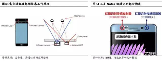 在消費(fèi)級終端上,虹膜識別的信息和算法的初步處理是通過 ASIC 芯片完成,然后數(shù)據(jù)傳輸至手機(jī) CPU 進(jìn)行進(jìn)一步的分析,從而實(shí)現(xiàn)身份認(rèn)證、支付等功能。例如,根據(jù)韓國媒體的報(bào)道,三星虹膜識別系統(tǒng)主要的算法來自 Princeton Identity,紅外攝像頭模組來自于韓國廠商 Patron,鏡頭來自于韓國廠商 Kolen,CIS 是三星自家提供,紅外LED 由歐司朗提供,最終方案由 Princeton Identity 負(fù)責(zé)。