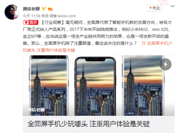 通信行業(yè)資深分析師@通信老柳 表示:全面屏手機(jī),實(shí)際上是一種18:9的大屏幕手機(jī),“全面屏代表了智能手機(jī)的新方向”,它是整個(gè)產(chǎn)業(yè)鏈共同努力的結(jié)果,對(duì)于消費(fèi)者而言,一款好用的全面屏手機(jī),除了要符合大眾審美的外觀設(shè)計(jì),還應(yīng)該具備完備的功能,不能因?yàn)閱渭冏非笸庥^而犧牲了基本功能,比如聽筒和前置攝像頭等。