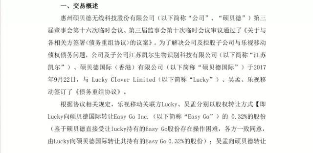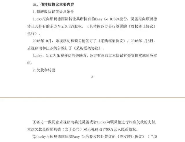 據(jù)悉,2016年10月,樂(lè)視移動(dòng)和碩貝德簽訂了《采購(gòu)框架協(xié)議》;2016年1月5日,樂(lè)視移動(dòng)和江蘇凱爾簽訂了《采購(gòu)框架協(xié)議》。本次債務(wù)重組中,樂(lè)視移動(dòng)委托關(guān)聯(lián)方吳孟或者Lucky向碩貝德進(jìn)行相應(yīng)欠款的支付。本次欠款是指碩貝德(含子公司)對(duì)樂(lè)視移動(dòng)1700萬(wàn)元人民幣債權(quán)。