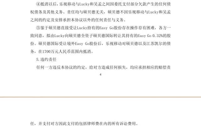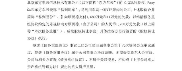 通過(guò)上述股權(quán)轉(zhuǎn)讓,樂(lè)視移動(dòng)方面向碩貝德支付1689萬(wàn)元和11萬(wàn)元的欠款,以結(jié)清債務(wù)重組協(xié)議約定的樂(lè)視移動(dòng)對(duì)碩貝德(含子公司)的人民幣1700萬(wàn)元欠款。后續(xù)股權(quán)轉(zhuǎn)讓事宜,具體按各方另行簽署的《股權(quán)轉(zhuǎn)讓協(xié)議》執(zhí)行。
