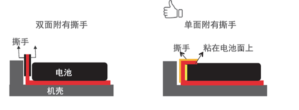 易拉膠模切件撕手是一小塊附有薄膜的膠面,為了方便易拉膠的抽拉。撕手的設計對于剛開始抽拉的斷裂率有較大影響,因此需要結(jié)合電子設備內(nèi)部的結(jié)構(gòu)進行合理的設計。