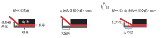 電池周圍的外框設計很重要,因為它會給接下來的移除產(chǎn)生很大影響。為了得到理想的抽拉結(jié)果,建議在電池和外框間保持≥1mm 的空間,并且盡可能低的外框高度。為了使移除過程有盡可能小的角度和簡單操作,建議: