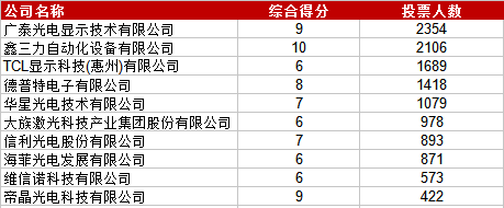 此外,順應(yīng)今年全面屏發(fā)展趨勢(shì),本次獎(jiǎng)項(xiàng)也列出了全面屏技術(shù)創(chuàng)新獎(jiǎng),而根據(jù)投票結(jié)果來(lái)看,全面屏也確實(shí)引起了整個(gè)行業(yè)的關(guān)注,票數(shù)整體較高。其中,廣泰光電以2354票暫列第一,鑫三力、TCL、德普特等都緊隨其后,有望隨時(shí)超越。目前該獎(jiǎng)項(xiàng)排名前十企業(yè)情況如下: