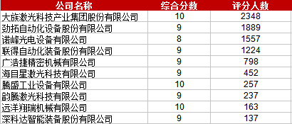 還有十大自動(dòng)化解決方案提供商獎(jiǎng)項(xiàng),此獎(jiǎng)項(xiàng)可謂是競(jìng)爭(zhēng)最為激烈的獎(jiǎng)項(xiàng)之一了,前四名票數(shù)都領(lǐng)先于其他獎(jiǎng)項(xiàng)大族激光以2348票暫時(shí)領(lǐng)先,勁拓自動(dòng)化以1889票暫屈居第二,另外,諾峰、聯(lián)得也以高票暫列三、四名。目前該獎(jiǎng)項(xiàng)排名前十企業(yè)情況如下: