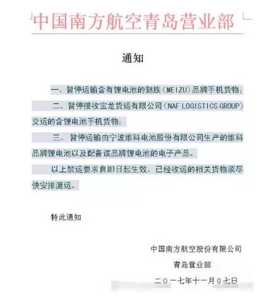 更讓人驚訝的是,11月7日網(wǎng)絡(luò)上曝光了中國南方航空青島營業(yè)部的紅頭文件,要求暫停運輸含有鋰電池的魅族手機產(chǎn)品,以及生產(chǎn)相關(guān)電池配件的企業(yè)的產(chǎn)品,“禁運要求立即生效、已經(jīng)收運的相關(guān)貨物需盡快安排退運”;同時,中國國航也下發(fā)了緊急通知,要求下屬單位暫停運輸魅族手機產(chǎn)品。