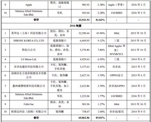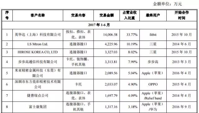 而從其客戶群體來看的話,也主要是圍繞智能手機(jī)、可穿戴設(shè)備以及筆記本電腦三大市場,手機(jī)市場主要通過LS、HIROSE、凱赫威為三星手機(jī)供貨,通過威博精密以及直銷為OPPO、vivo供貨(威博今年已經(jīng)被安潔科技以34億元的價(jià)格收購);可穿戴設(shè)備市場主要包括英華達(dá)、偉創(chuàng)力等代工廠為fitbit供貨,同時(shí)其還通過米亞精密金屬為蘋果手機(jī)供貨,以及通過歌爾聲學(xué)為華為手表供貨,筆記本市場則主要通過廣興電子為聯(lián)想供貨!