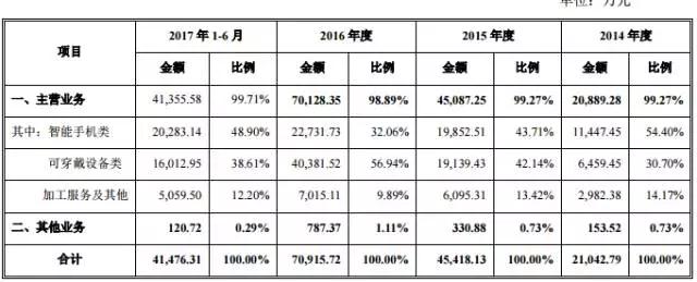 截至目前,從其產(chǎn)品營收結(jié)構(gòu)來看,在過去的幾年中主要依托于智能手機(jī)以及可穿戴設(shè)備市場,這兩大市場營收占比超過了公司總營收的99%。從2014年到2017年上半年,智能手機(jī)市場營收占比分別為54.40%、43.71%、32.06%、48.90%,可穿戴設(shè)備市場營收占比分別為30.70%、42.14%、56.94%、38.61%。值得一提的是,公司營收在過去三年也大幅度增長,2014年到2017年上半年總營收分別為2.10億、4.54億、7.09億、4.14億!
