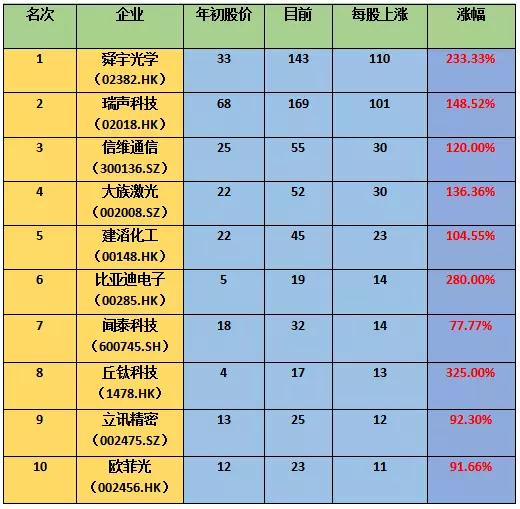 在十大牛股中,其中漲幅超過兩倍的有丘鈦科技、比亞迪電子和舜宇光學(xué),三者均為港股,漲幅超過一倍的有瑞聲科技、信維通信、大族激光、建滔化工,漲幅接近一倍的有立訊精密、歐菲光以及聞泰科技!