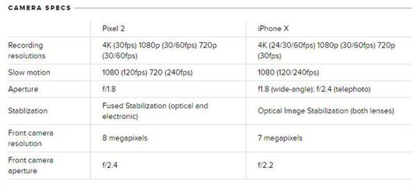Pixel 2和iPhone X的相機(jī)參數(shù)如下表,可以看到,兩者的主攝像頭均為f/1.8光圈,也就是說(shuō)在感光度上差不多。但蘋(píng)果勝在視頻支持1080P@240fps錄制,且支持4K@60fps視頻拍攝,而且iPhone X雙攝均支持光學(xué)防抖,Pixel 2則支持融合防抖(光學(xué)+電子防抖)。從紙面參數(shù)來(lái)看,iPhone X似乎稍勝一籌。