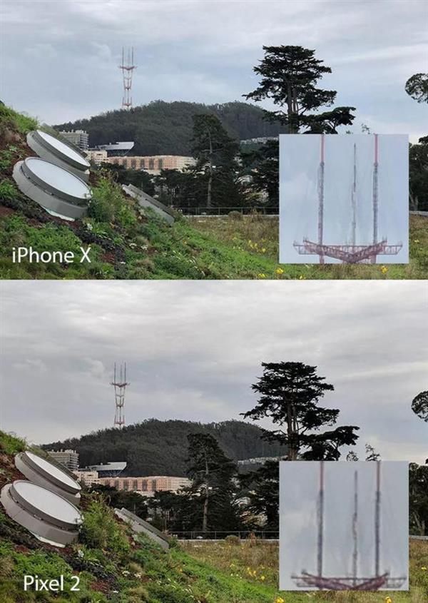 iPhone X的副攝像頭支持2倍光學(xué)變焦,Pixel 2則僅支持傳統(tǒng)的數(shù)碼變焦,兩者的拍照差異十分明顯。如圖所示,100%放大之后Pixel 2對(duì)信號(hào)塔的呈現(xiàn)已經(jīng)有些模糊,而iPhone X還能看到很多線條。