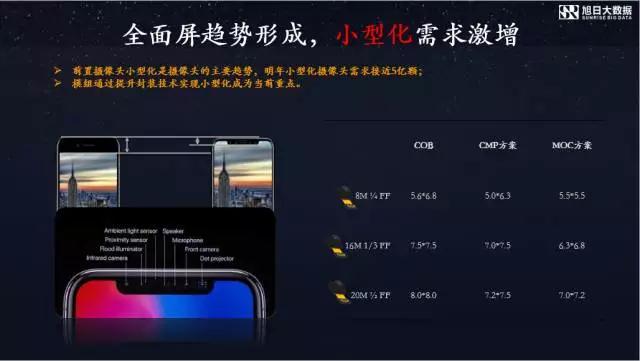 李春麗認為,攝像頭已經(jīng)是智能手機不可或缺部件之一,未來手機攝像頭將會朝著小型化、專業(yè)化和智能化方向這三個方向發(fā)展,其中,小型化一直是手機攝像頭追逐的目標,而全面屏手機留給攝像頭的空間更小,進一步提升了攝像頭小型化的需求,據(jù)旭日大數(shù)據(jù)統(tǒng)計,明年單全面屏前置攝像頭對小型化的需求就接近5億顆。未來后置小型化需求也會逐漸釋放,小型化需求將進一步提升,目前通過封裝技術來實現(xiàn)模組小型化的效果明顯,未來具備這些技術的模組廠具有很大的競爭力。